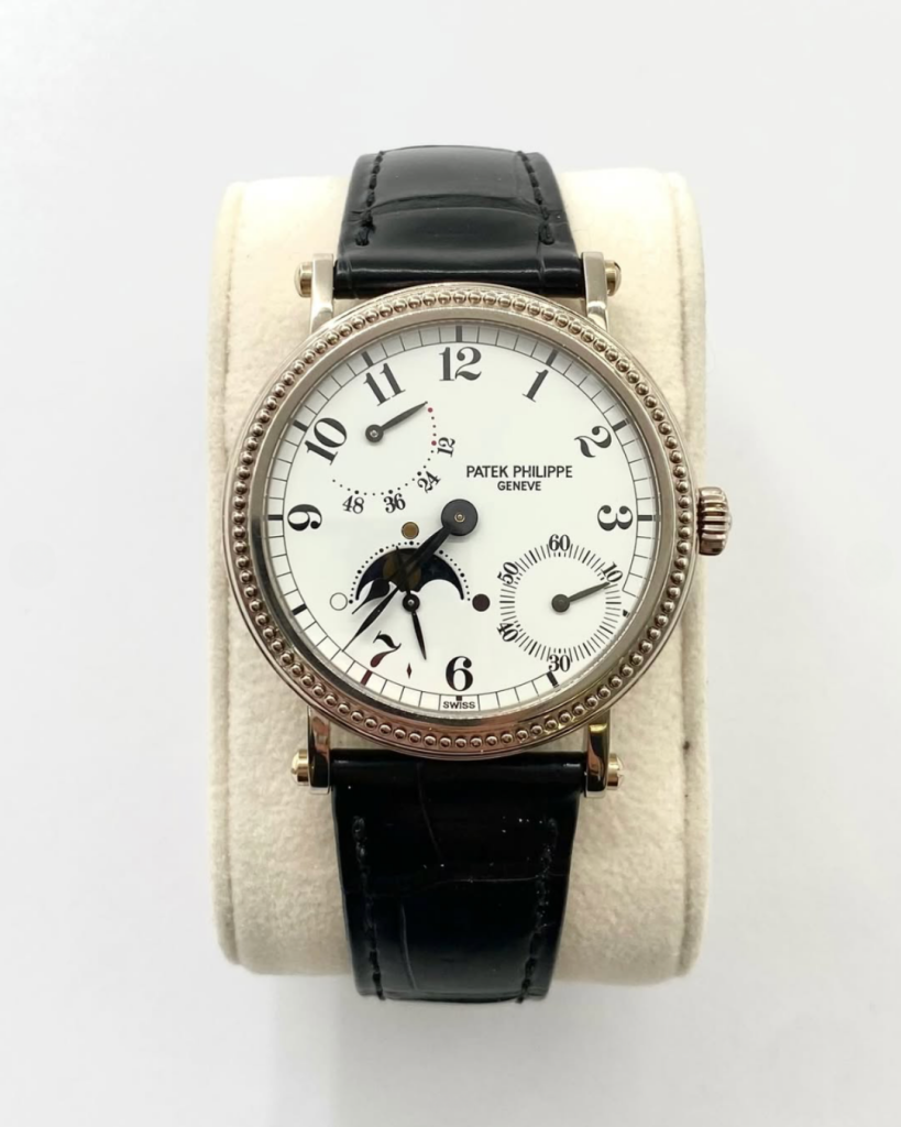 2002 Montre-bracelet en or blanc 18k Cadran blanc porcelaine, chiffres arabes, ouverture pour les phases de la lune Mouvement mécanique, poinçon de Genève, signé Boucle ardillon en or Diam. 35 mm - Poids : 62g. Certificat d’origine tamponné Patek Philippe à Genève, un écrin et une surboîte.